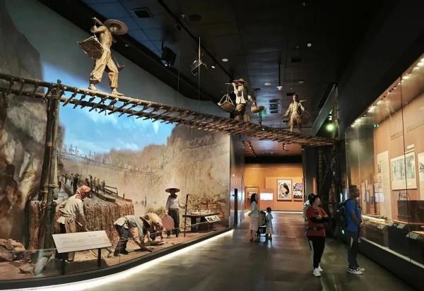 该博物馆的设计巧妙运用了场地,将背景中的挑夫横跨高空的场景搬运到有限的博物馆展示的上层空间来,不仅利用了空间,也将场景的凶险展示出来,让游客更有代入感。