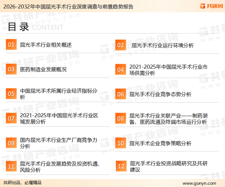 共研网发布的《2026-2032年中国屈光手术行业深度调查与前景趋势报告》共十二章。报告首先介绍了屈光手术行业定义、商业模式、产业壁垒、风险因素、产业特征及研究方法;接着在综合行业PEST环境的基础上对国内外市场屈光手术产品产销、规模以及价格特征做了重点分析;然后对于屈光手术行业本身或相关产业的贸易态势、经营状况进行剖析;随后对屈光手术行业产业链运行环境、区域发展态势、行业竞争格局、典型企业运营等几大核心要素进行了逐个分析;随后报告对屈光手术行业供需、价格、规模、风险、策略做出来科学严谨的预判。您若想对屈光手术行业有个系统的了解或者想投资屈光手术行业,本报告是您不可或缺的重要工具。